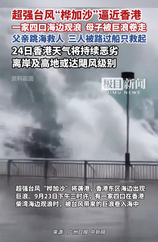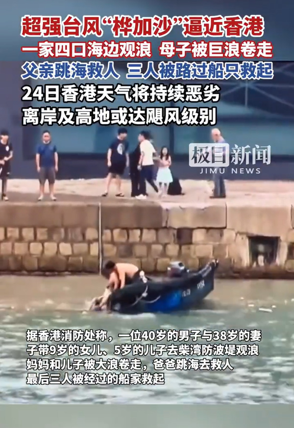 超強臺風“樺加沙”來襲,香港海邊驚現險情。一家四口海邊觀浪,母子被巨浪卷走,被巨浪卷走,父親跳海救人。幸運的是,三人被路過船只及時救起。